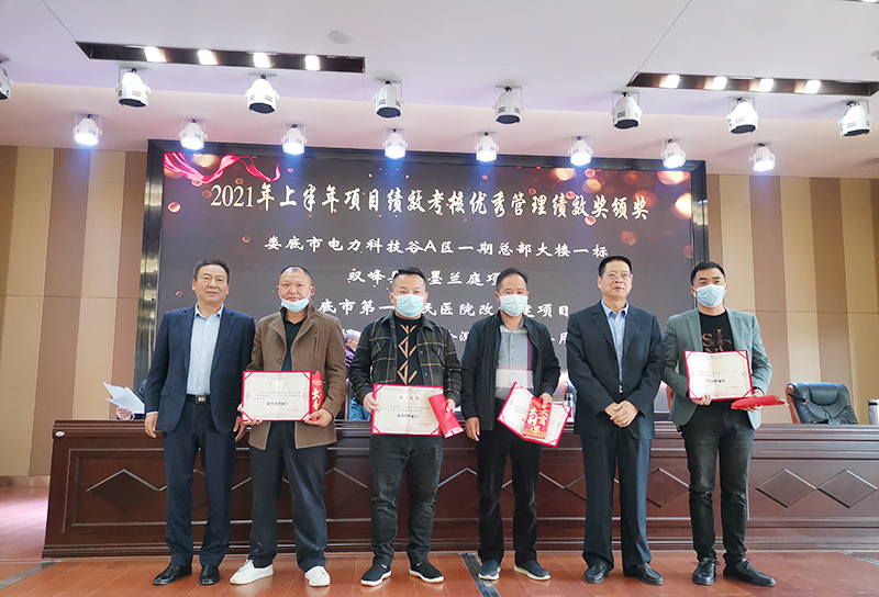 5黨支部書記林有良(右二)、總經(jīng)理助理姜建輝(左一)為績效考核中獲得優(yōu)秀管理績效項(xiàng)目頒獎