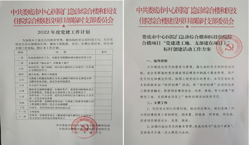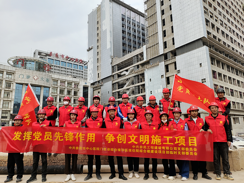 該項(xiàng)目地處婁底市最繁華街道的十字路口,又是婁底市最大的單體建筑公共項(xiàng)目。項(xiàng)目中標(biāo)后,公司立即配備優(yōu)秀骨干組建項(xiàng)目部班子,并成立了中共婁底市中心醫(yī)院門急診綜合樓和醫(yī)技住院綜合樓建設(shè)項(xiàng)目部臨時(shí)支部委員會(huì),推舉項(xiàng)目經(jīng)理姚春旭擔(dān)任臨時(shí)黨支部書記,并安排了黨建指導(dǎo)員。該支部目前有黨員8人。項(xiàng)目部設(shè)置了黨員活動(dòng)室,文化走廊等,臨時(shí)黨支部“五化”建設(shè)達(dá)標(biāo)。