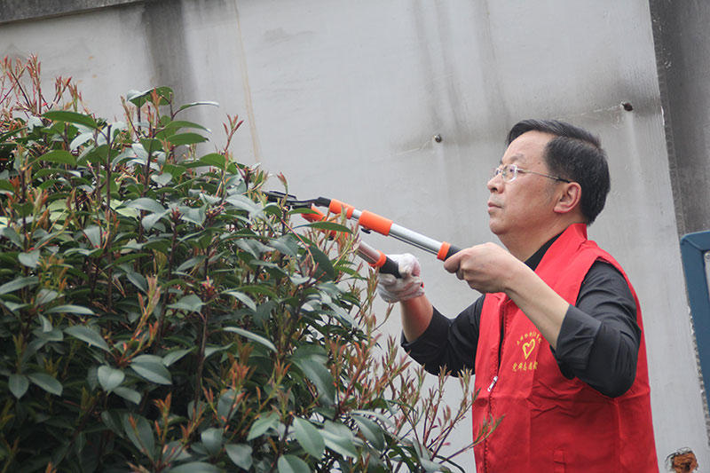 活動(dòng)現(xiàn)場(chǎng),志愿者們身穿紅馬甲化身“保潔”清潔公路、撿綠化帶里的垃圾;化身“園林技師”修剪綠植、施肥、澆水。